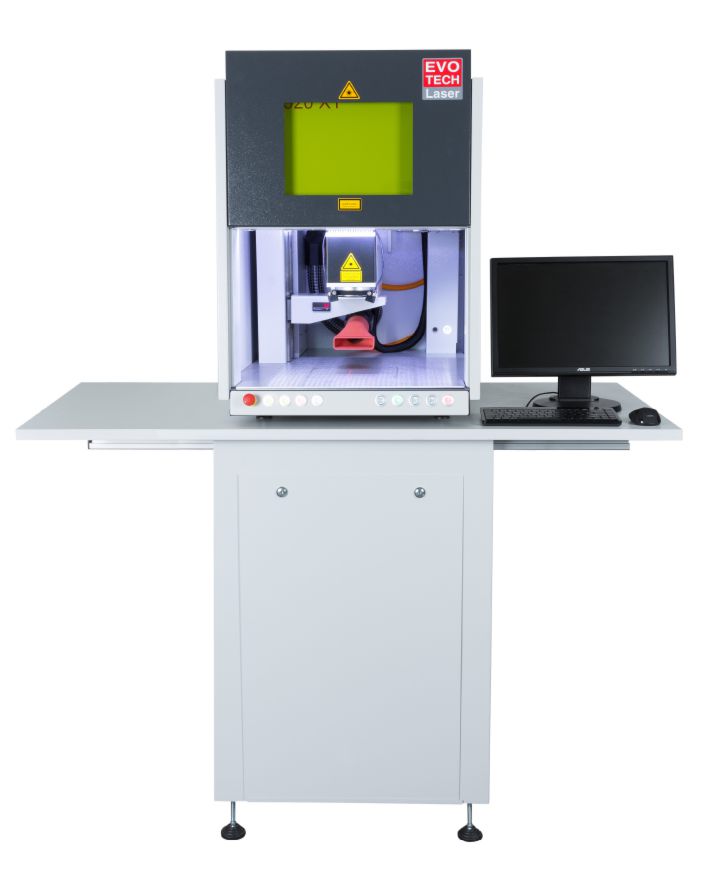Werkstücke in der Größe DIN A4 können sowohl plan als auch hochkant komplett beschriftet werden. Laserkopf: Faserlaser 20 Watt -